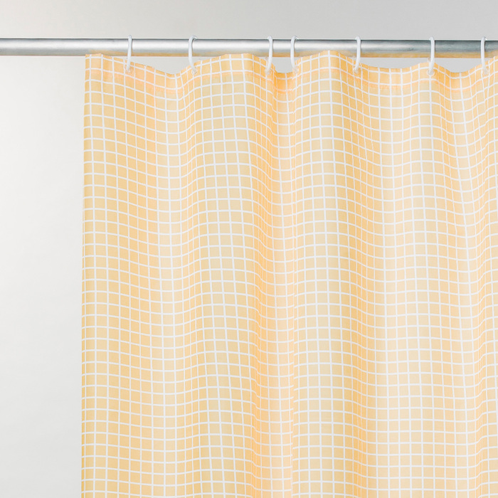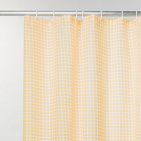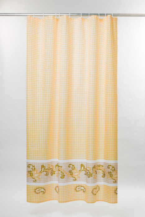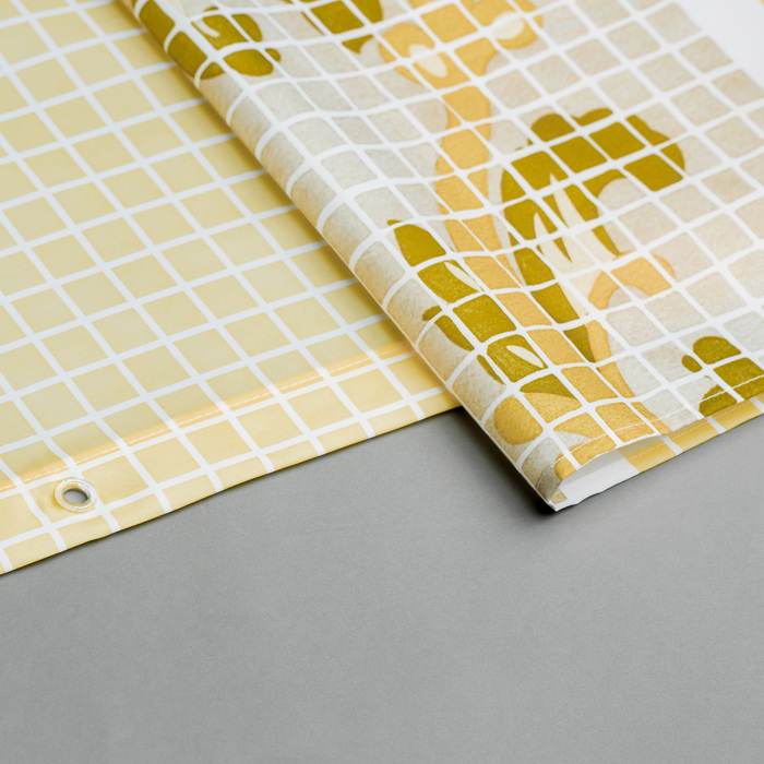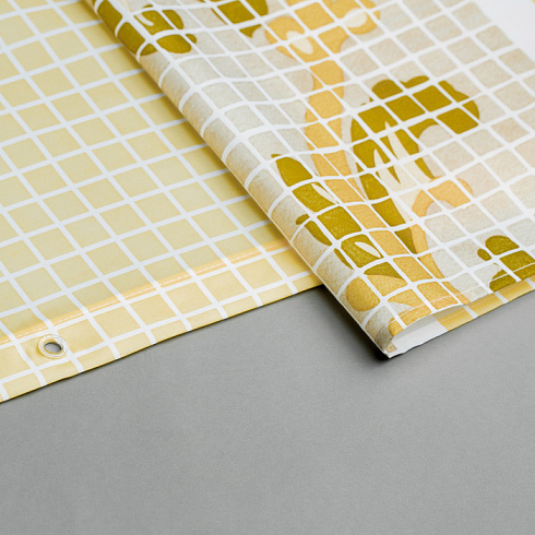 Непрозрачная штора для ванной вкусного лимонадного цвета с геометрическим рисунком в виде мозайки. Штора изготовлена из полиэстера с красивой атласной текстурой и деликатным блеском.