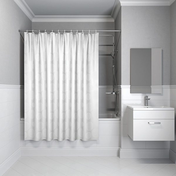 Непрозрачная светлая штора для ванной в классическом стиле с матовым геометрическим принтом в виде кругов. Штора изготовлена из полиэстера с красивой атласной текстурой и деликатным блеском.