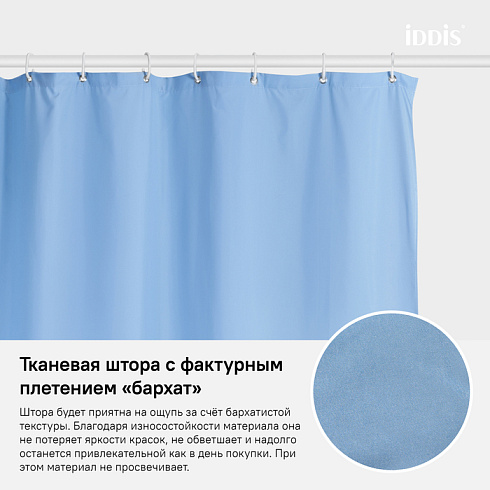 Однотонная текстильная штора для ванной василькового цвета с приятной на ощупь фактурой, бархатистой, как кожа персика. Напоминает обычные шторы и соответствует актуальному тренду оформления ванной как уютной жилой комнаты.