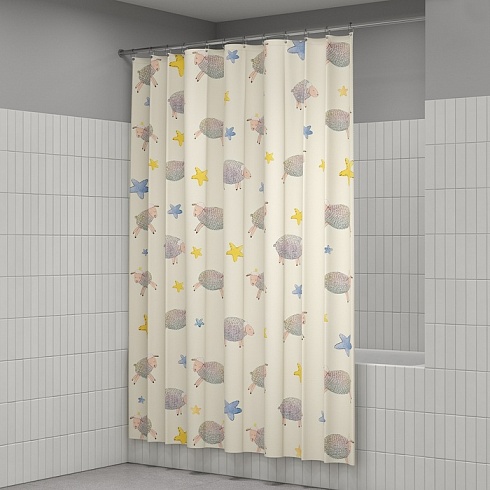 Текстильная штора для ванной светло-бежевого цвета с веселыми овечками и звездами. Идеально подойдет для детской или семейной ванной комнаты.