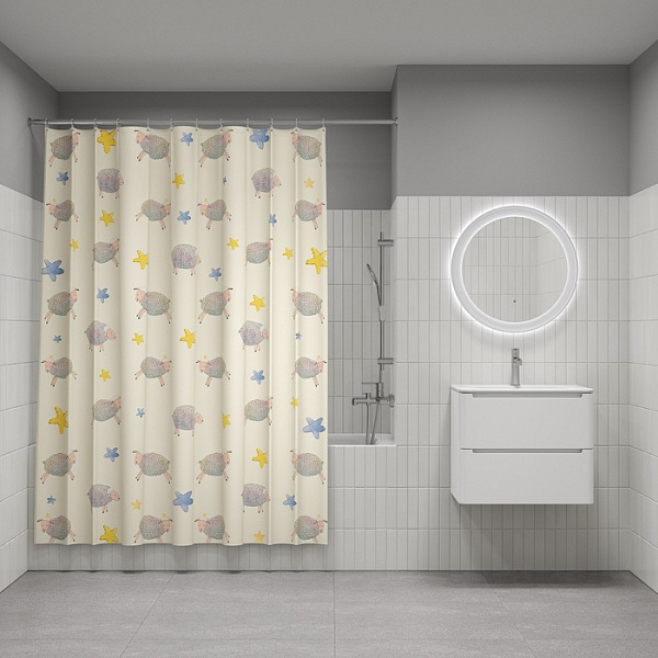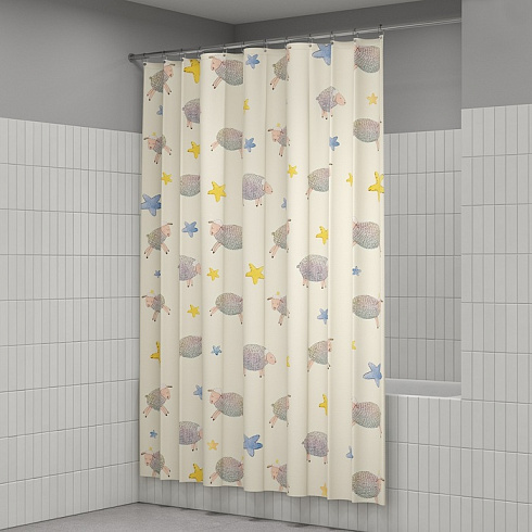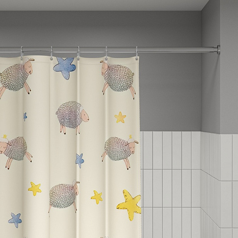 Текстильная штора для ванной светло-бежевого цвета с веселыми овечками и звездами. Идеально подойдет для детской или семейной ванной комнаты.