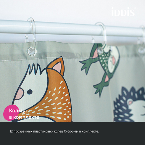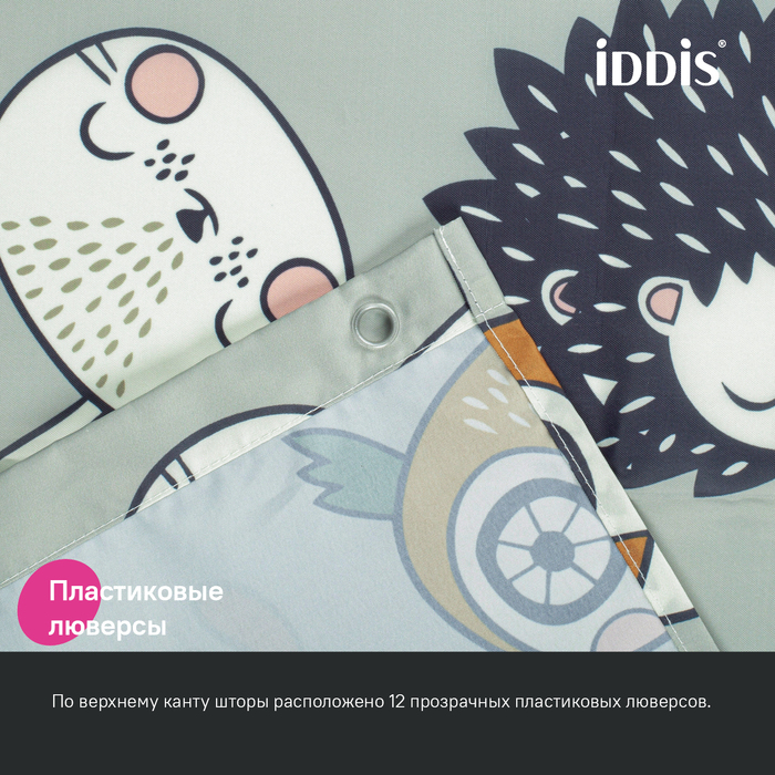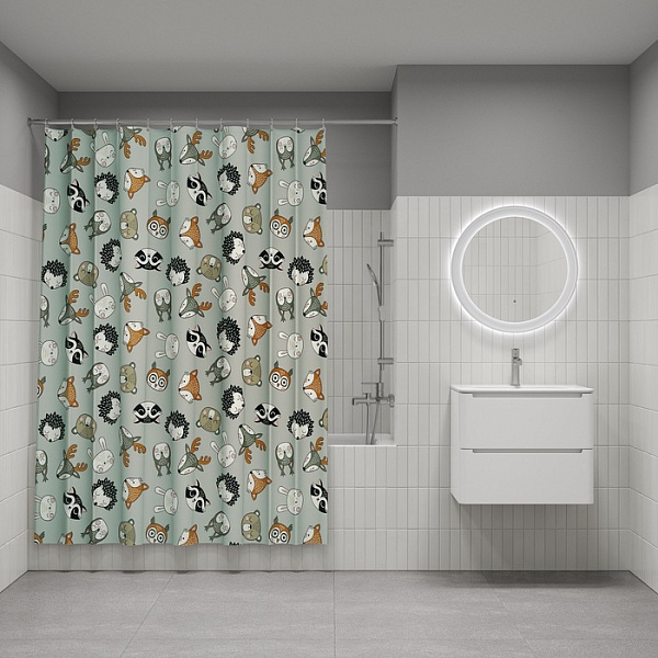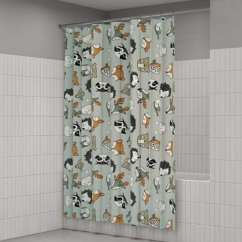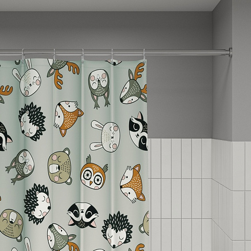 Текстильная штора для ванной светло-серого цвета с милым принтом в виде мордочек лесных зверей. Идеально подойдет для детской или семейной ванной комнаты.