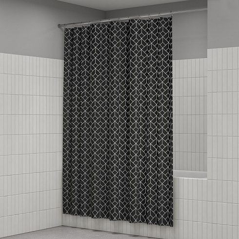 Текстильная штора для ванной черного цвета с белым геометричным принтом в стиле ар-деко.