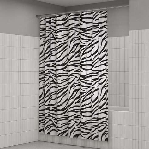 Текстильная штора для ванной черно-белого цвета с анималистичным принтом в виде расцветки зебры.