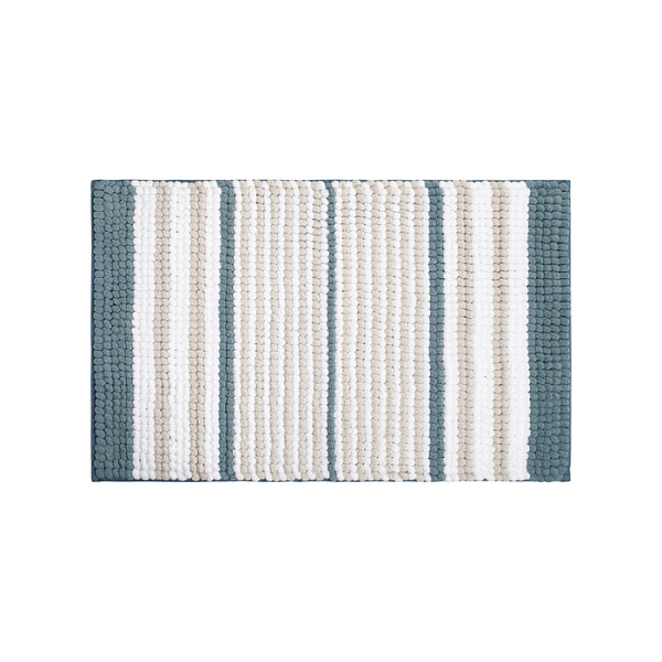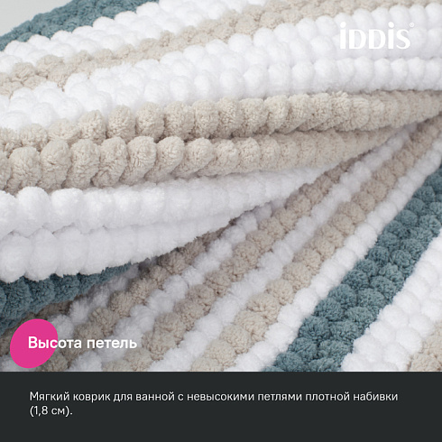 Коврик для ванной комнаты с узором из акцентных сине-зеленых полос в сочетании с белым и бежевым поможет сделать ее уютной и теплой. Коврик приятный и мягкий на ощупь, имеет массажный эффект. Крупный и плотный петельчатый ворс из полиэстера легко чистится и быстро сохнет. Коврик подойдет для ванной и туалета.