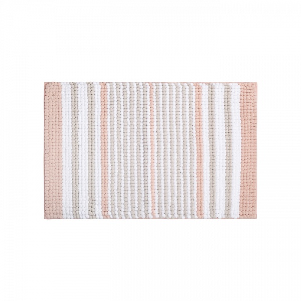 Коврик для ванной комнаты с узором из полос нежно-розового цвета в сочетании с белым и бежевым поможет сделать ее уютной и теплой. Коврик приятный и мягкий на ощупь, имеет массажный эффект. Крупный и плотный петельчатый ворс из полиэстера легко чистится и быстро сохнет. Коврик подойдет для ванной и туалета.
