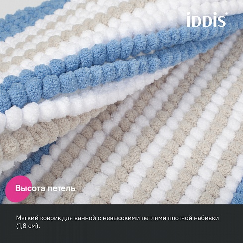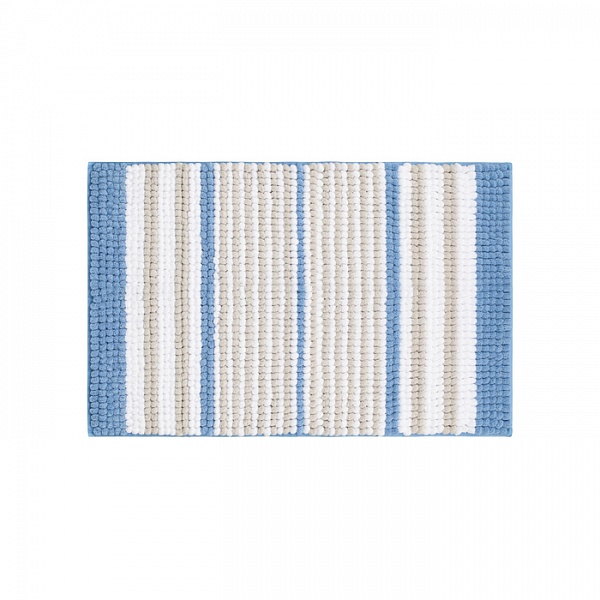 Коврик для ванной комнаты с узором из полос небесно-голубого цвета в сочетании с белым и бежевым поможет сделать ее уютной и теплой. Коврик приятный и мягкий на ощупь, имеет массажный эффект. Крупный и плотный петельчатый ворс из полиэстера легко чистится и быстро сохнет. Коврик подойдет для ванной и туалета.