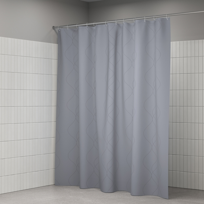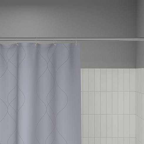 Текстильная штора для ванной серого оттенка с тонким узором выглядит изысканно и стильно и подойдет к интерьеру в любом стиле.