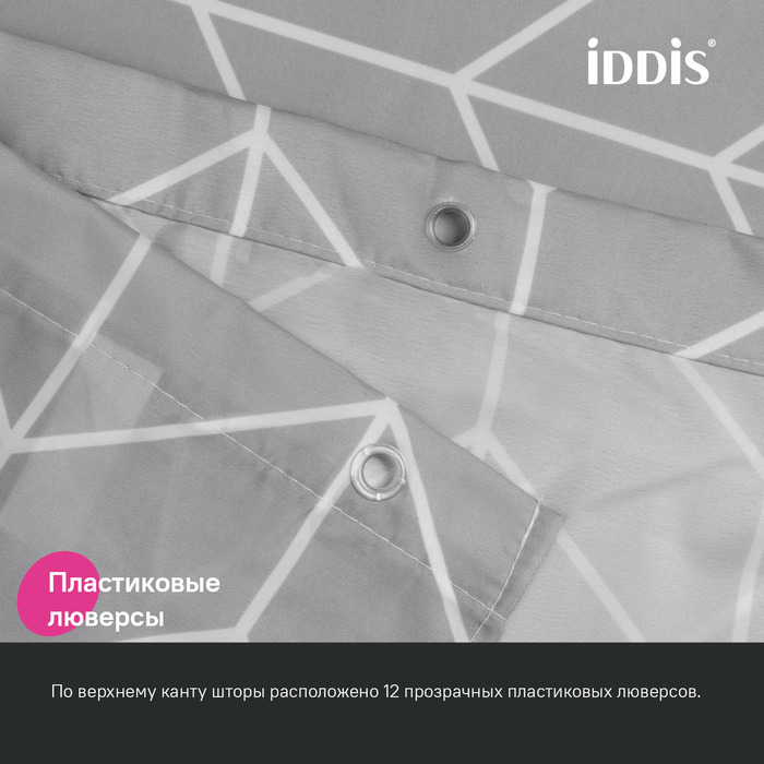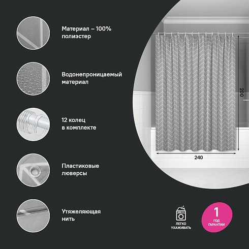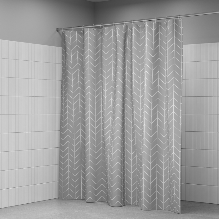 Текстильная штора для ванной серого цвета с белым геометричным узором подойдет и к светлому, и темному интерьеру.