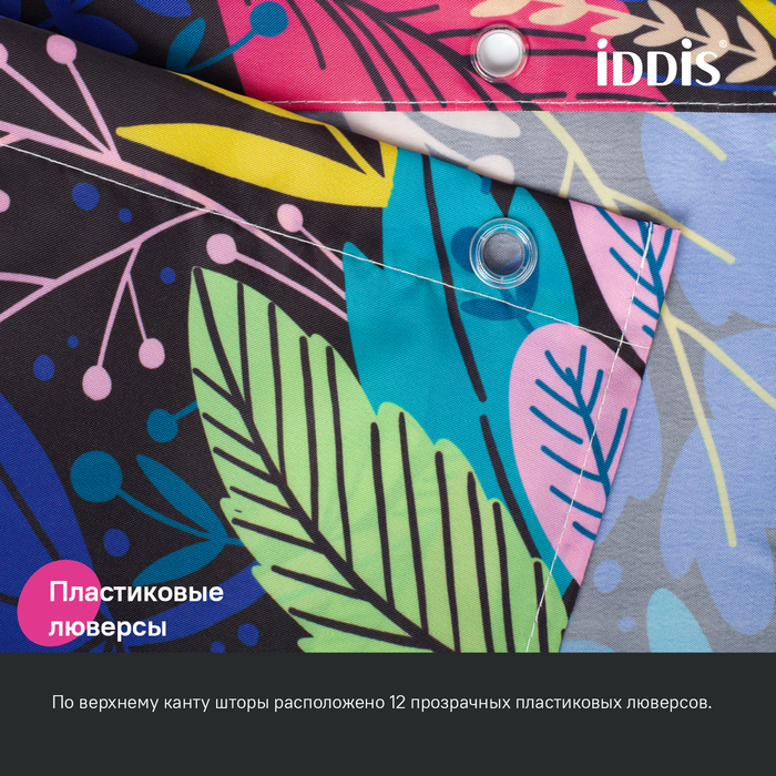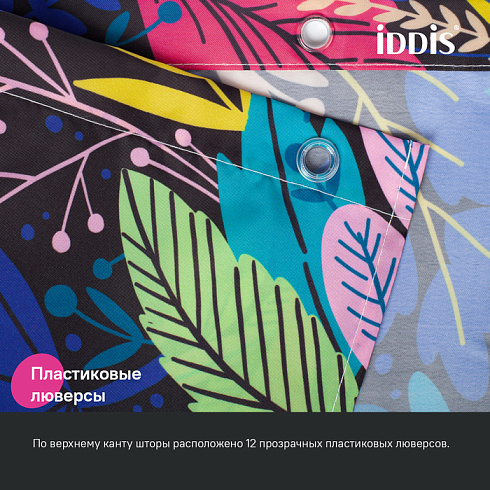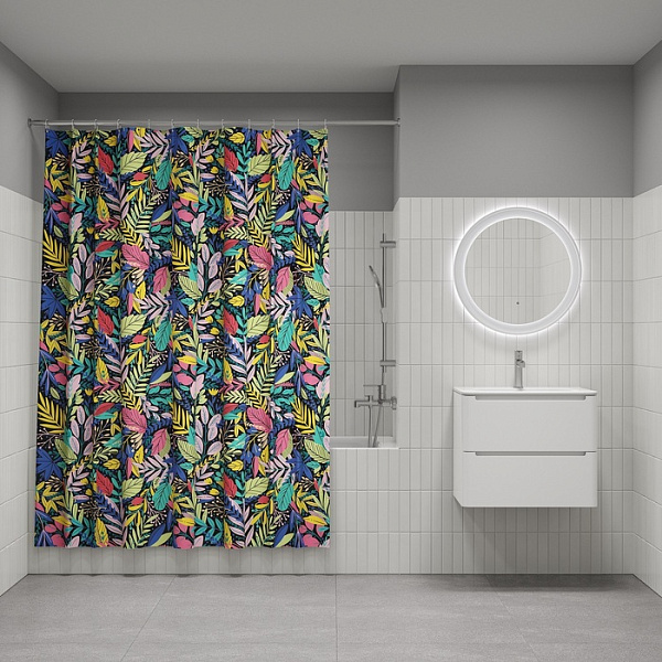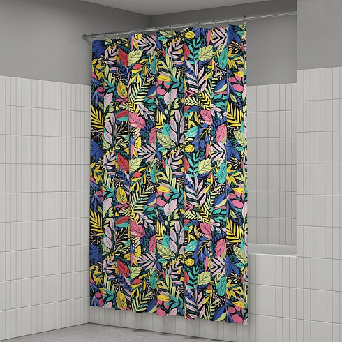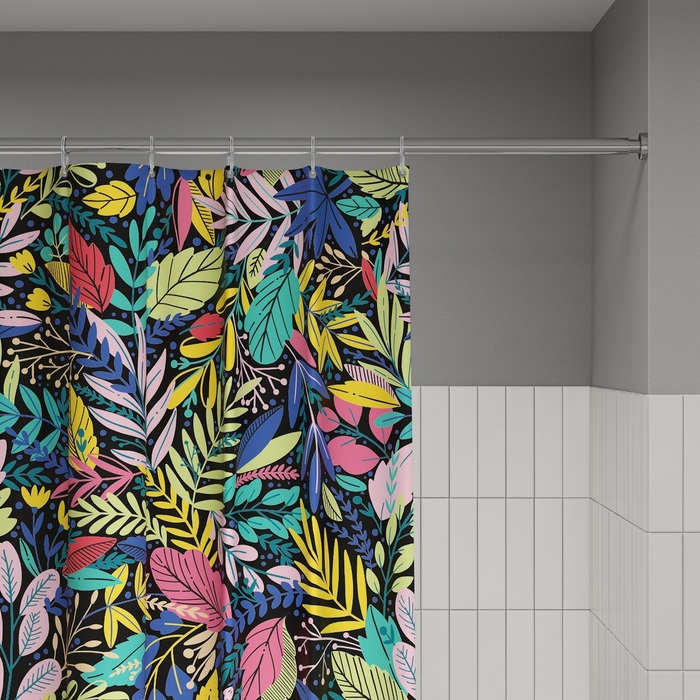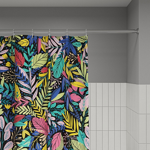 Текстильная штора для ванной с ярким разноцветным растительным принтом на черном фоне.