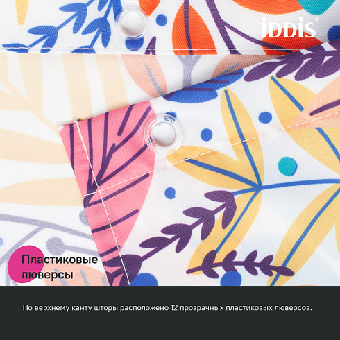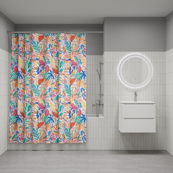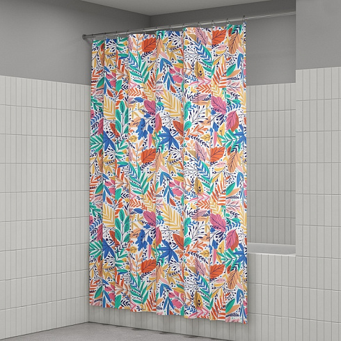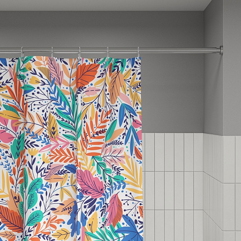 Текстильная штора для ванной белого цвета с ярким разноцветным растительным принтом.