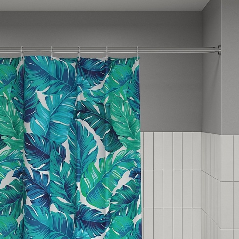 Текстильная штора для ванной с ярким сине-зеленым принтом из тропических листьев.