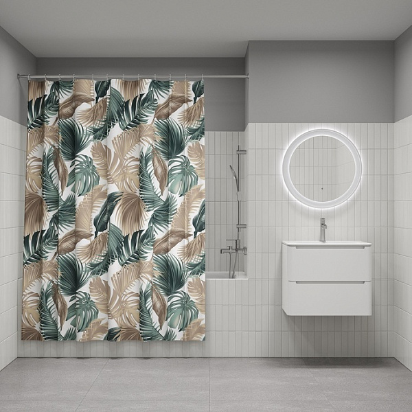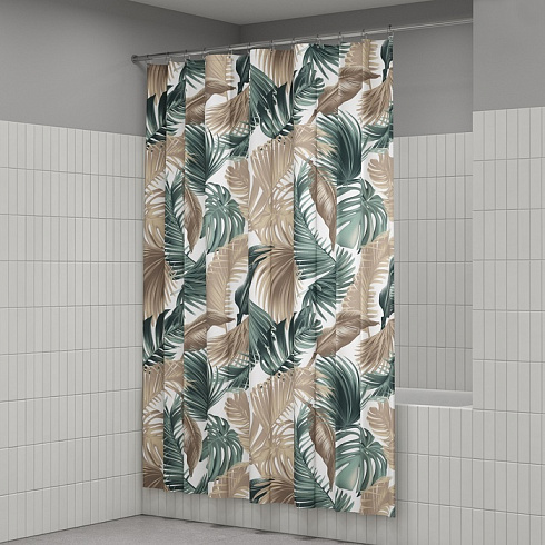 Текстильная штора для ванной с принтом из тропических листьев в природных бежево-зеленых тонах.