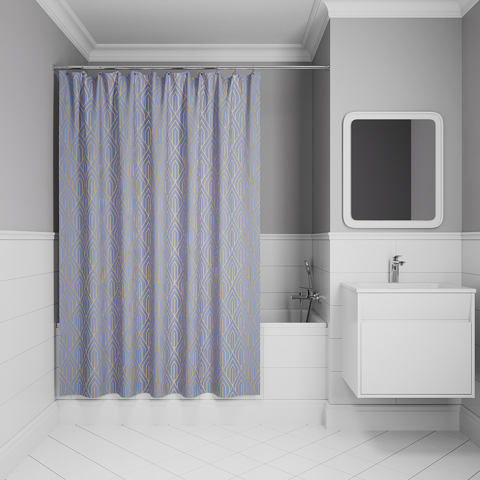 Текстильная штора для ванной красивого лилового оттенка с крупным геометричным золотым узором в стиле ар-деко создаст утонченное элегантное настроение даже в самом простом интерьере.
