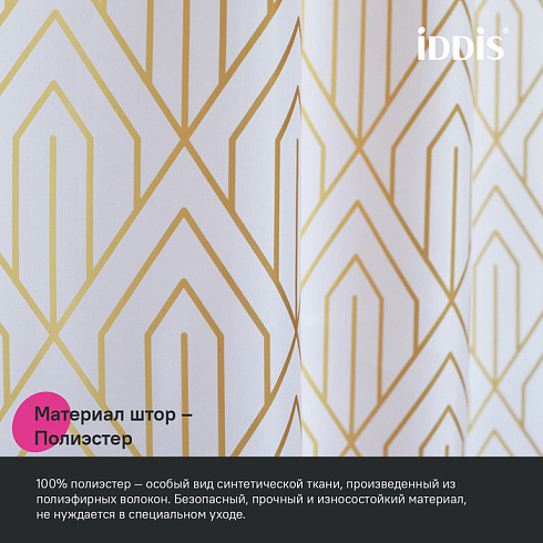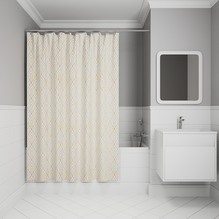 Текстильная штора для ванной белого цвета с крупным геометричным золотым узором в стиле ар-деко создаст утонченное элегантное настроение даже в самом простом интерьере.