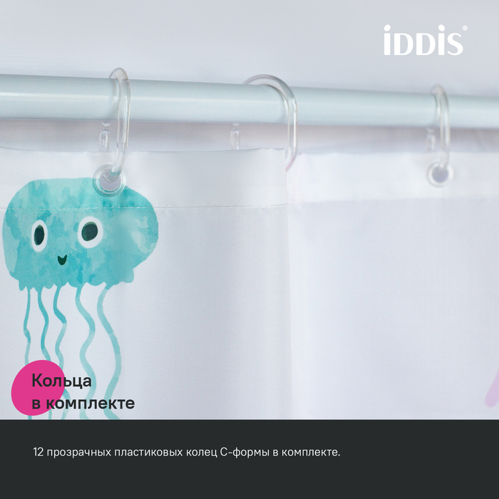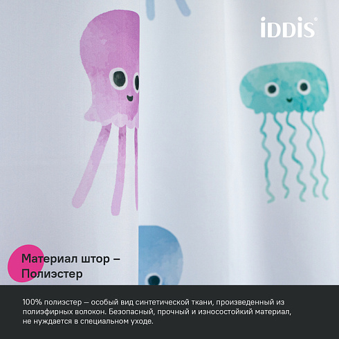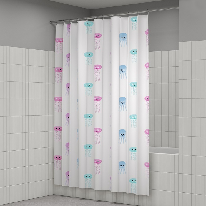 Текстильная штора для ванной белого цвета с принтом из забавных разноцветных медуз. Штора освежит пространство и привнесет в него легкое настроение.