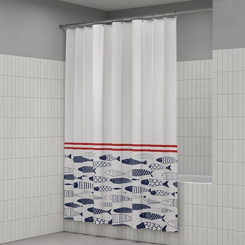 Текстильная штора для ванной белого цвета в морском стиле с принтом из синих рыб-сардин. Штора освежит пространство и привнесет в него легкое настроение.
