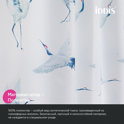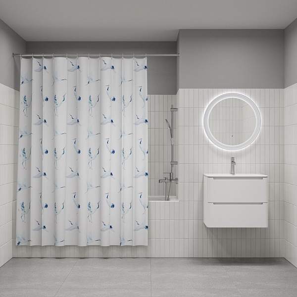 Текстильная штора для ванной белого цвета с изящными акварельными журавлями освежит любую ванную комнату.