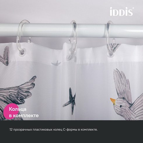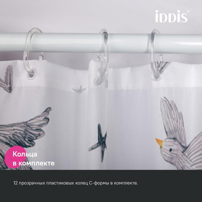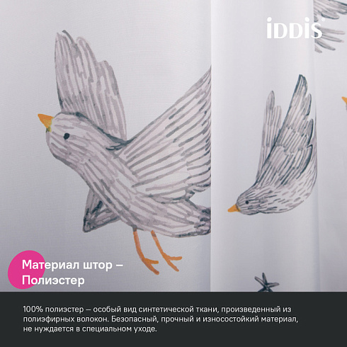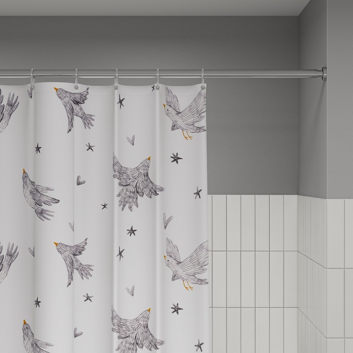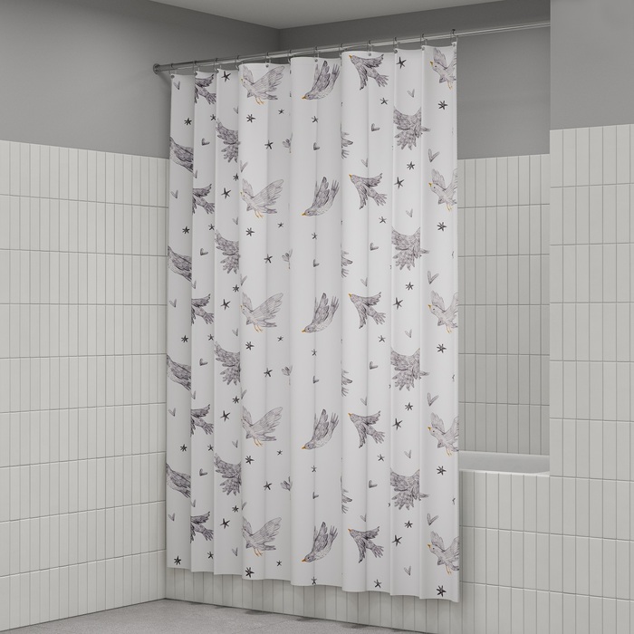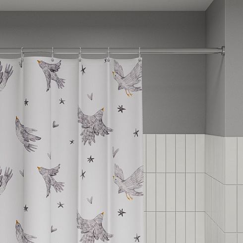 Текстильная штора для ванной белого цвета с принтом в виде летящих птиц. Штора освежит пространство и привнесет в него легкое настроение.