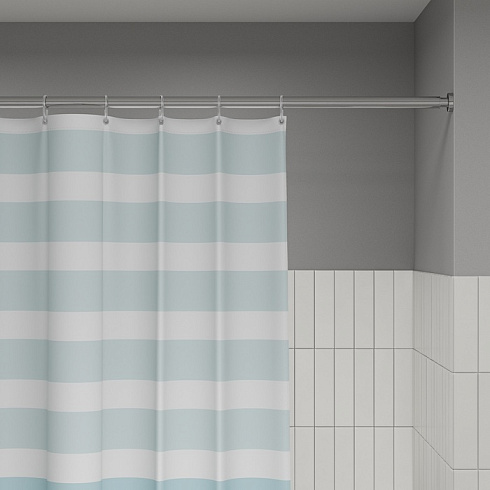 Текстильная белая штора для ванной с простым рисунком из широких горизонтальных полос в разных оттенках голубого цвета. Универсальная штора подойдет к любому интерьеру.