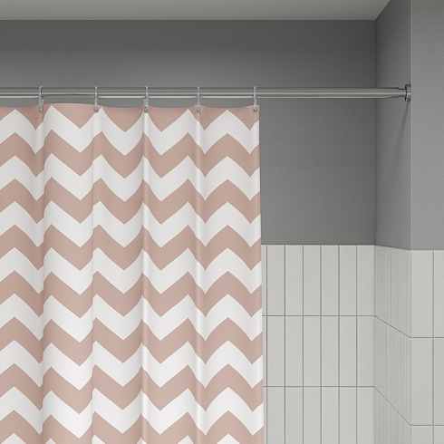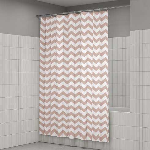 Текстильная белая штора для ванной с геометричным бежевым рисунком в виде зигзага. Универсальная штора подойдет к любому интерьеру.