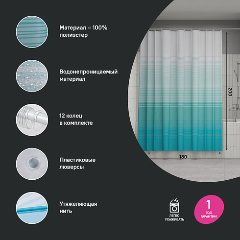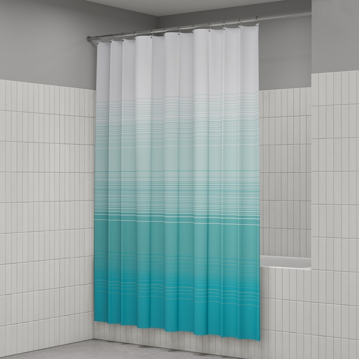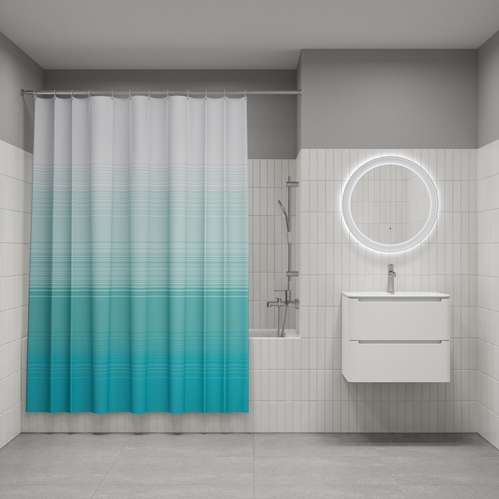 Текстильная белая штора для ванной с градиентным рисунком в сине-зеленых оттенках. Универсальная штора подойдет к любому интерьеру.