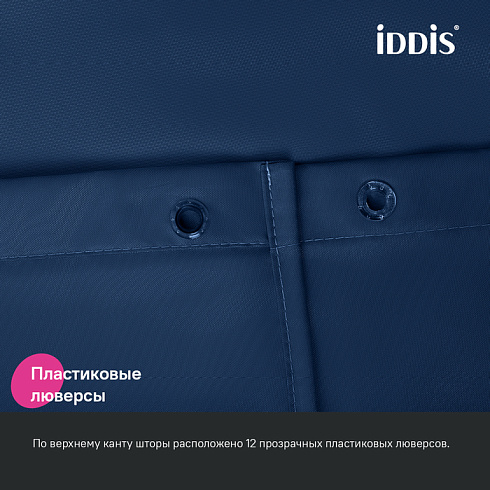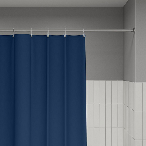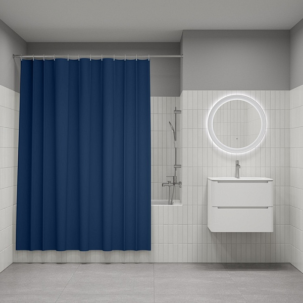 Текстильная штора для ванной насыщенного синего цвета будет гармонично смотреться и в светлом, и в темном интерьере.