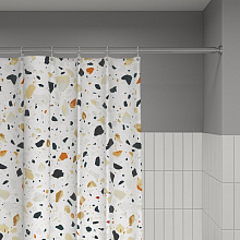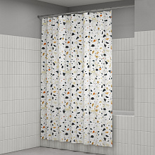 Текстильная штора для ванной белого цвета с принтом в виде модной плитки терраццо.