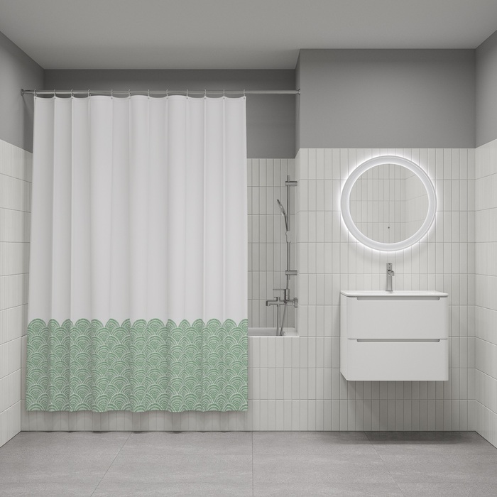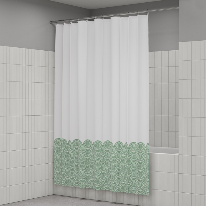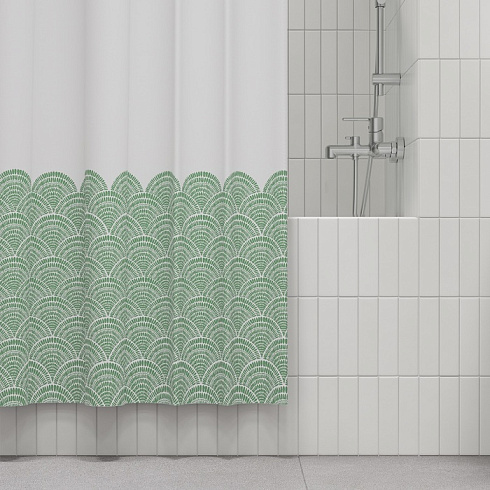 Текстильная штора для ванной белого цвета с фисташково-зеленым принтом в виде волн в средиземноморском стиле. Штора освежит пространство и привнесет в него легкое настроение.
