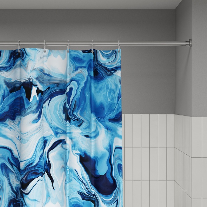 Текстильная штора с абстрактным узором в ярких голубых тонах разнообразит простой интерьер и привнесет в него необычные краски.