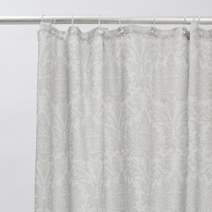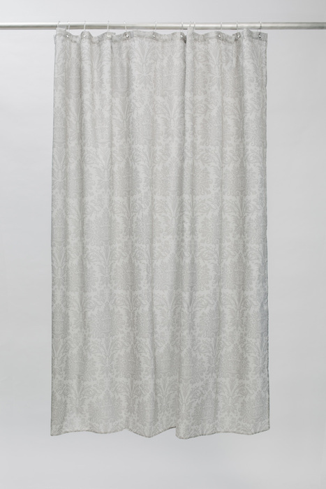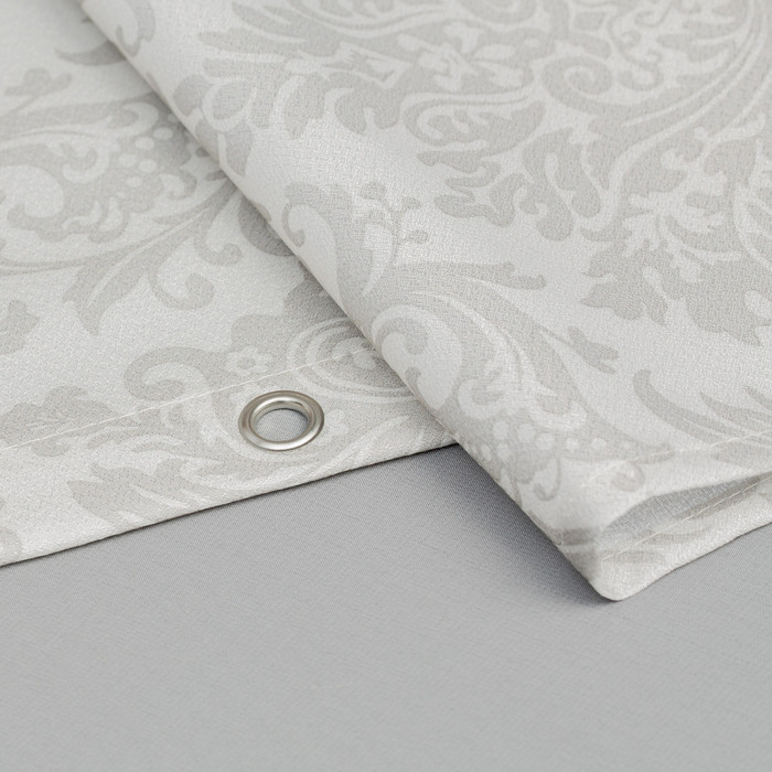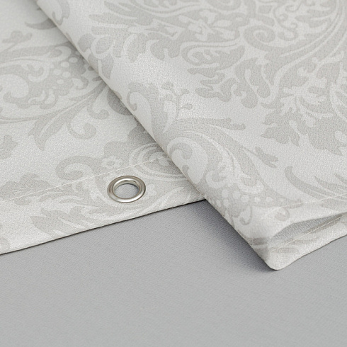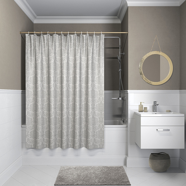Непрозрачная штора для ванной в мягких серых тонах с классическим рисунком выглядит дорого и изысканно и красиво мерцает. Штора изготовлена из полиэстера с фактурной текстурой и серебристыми вкраплениями.