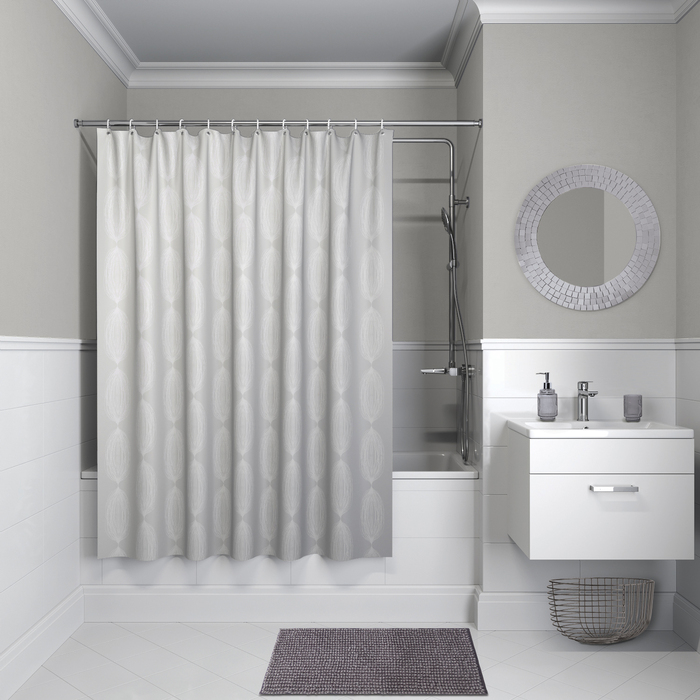 Непрозрачная текстильная штора для ванной светло-серого цвета с оригинальным геометрическим узором из шелковистых нитей. Напоминает обычные шторы и соответствует актуальному тренду оформления ванной как уютной жилой комнаты.
