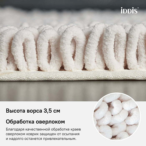 Плюшевый коврик для ванной нежного бежевого цвета с очень мягким и приятным на ощупь высоким ворсом (3,5 см) в виде плотных петель. Он отлично сохраняет тепло и держит форму, сохраняя красивый внешний вид. Коврик подойдет для ванной и туалета.