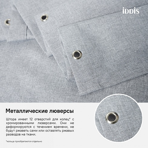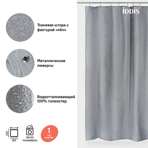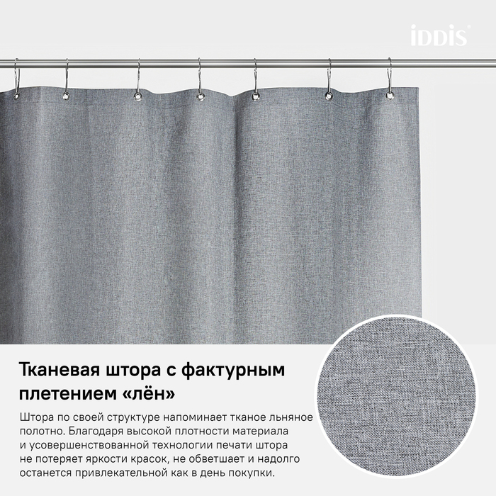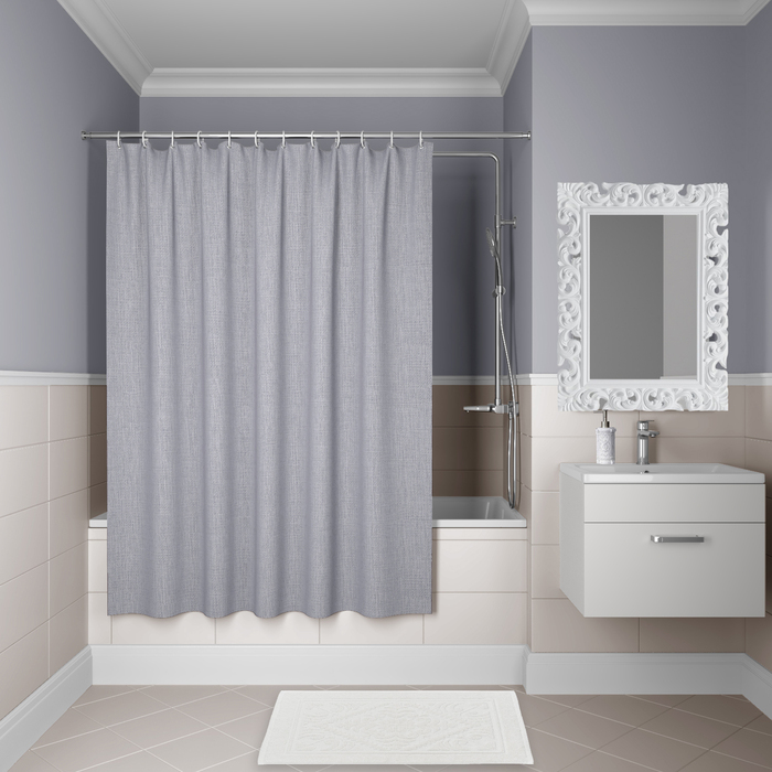 Однотонная плотная текстильная штора для ванной природного серого цвета с фактурой натурального льна, что делает ее элегантной и утонченной. Напоминает обычные шторы и соответствует актуальному тренду оформления ванной как уютной жилой комнаты.