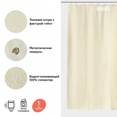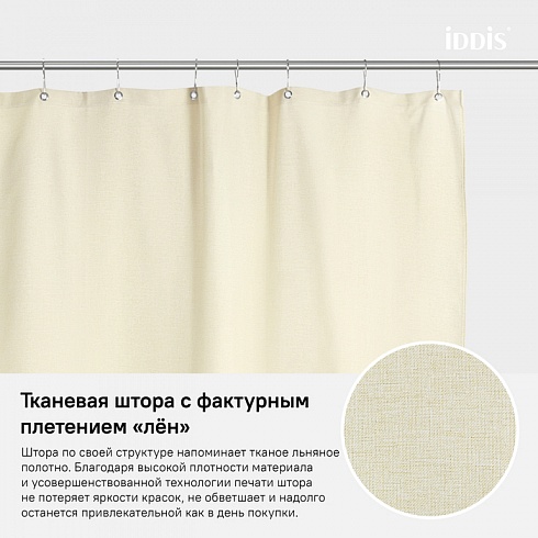 Однотонная плотная текстильная штора для ванной природного бежевого цвета с фактурой натурального льна, что делает ее элегантной и утонченной. Напоминает обычные шторы и соответствует актуальному тренду оформления ванной как уютной жилой комнаты.