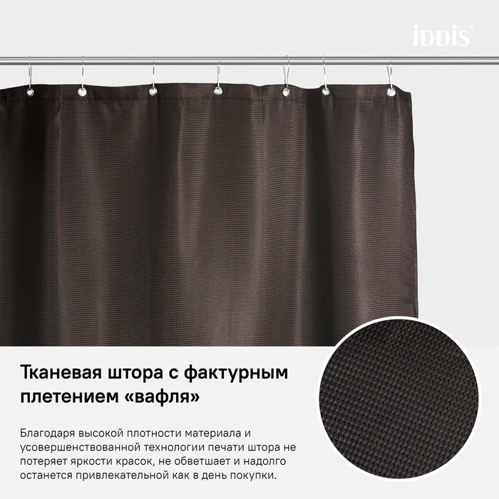 Однотонная текстильная штора для ванной цвета темного шоколада с фактурным рисунком «вафля». Напоминает обычные шторы и соответствует актуальному тренду оформления ванной как уютной жилой комнаты.