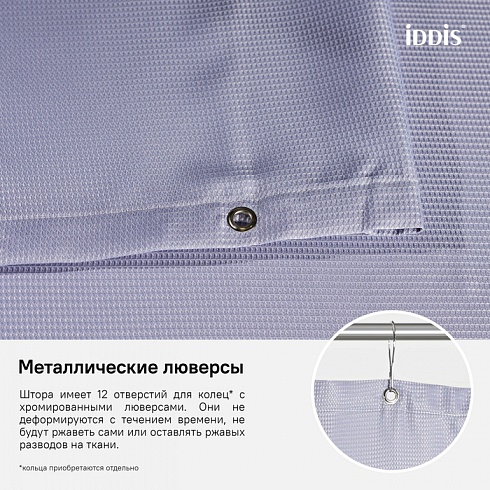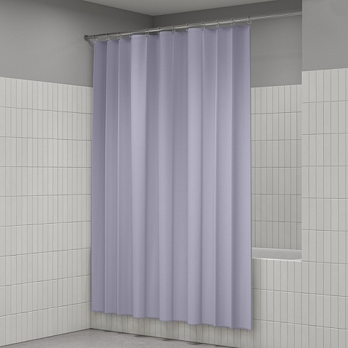 Однотонная текстильная штора для ванной лавандового цвета с фактурным рисунком «вафля». Напоминает обычные шторы и соответствует актуальному тренду оформления ванной как уютной жилой комнаты.