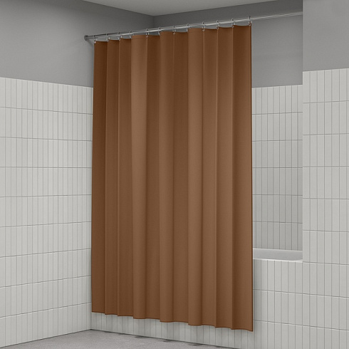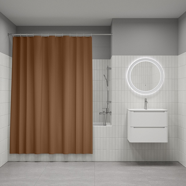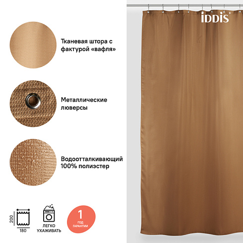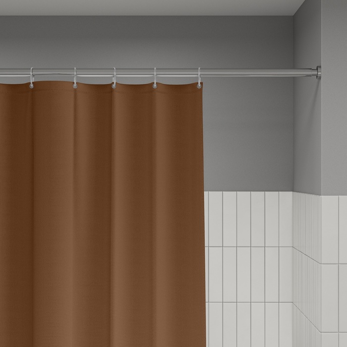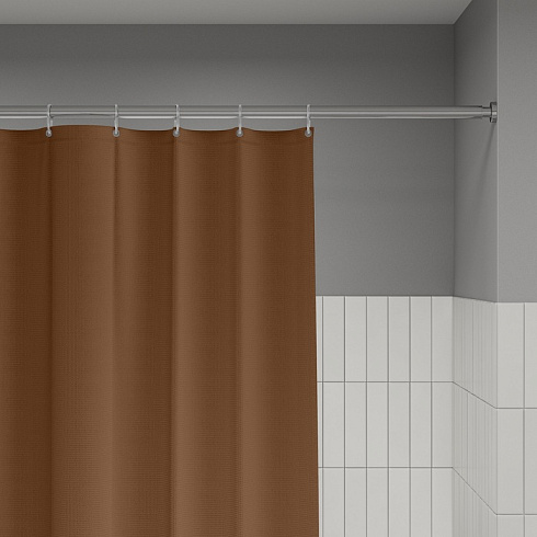 Однотонная текстильная штора для ванной песочного цвета с фактурным рисунком «вафля». Напоминает обычные шторы и соответствует актуальному тренду оформления ванной как уютной жилой комнаты.