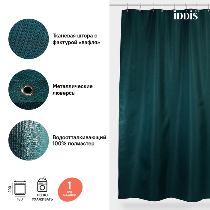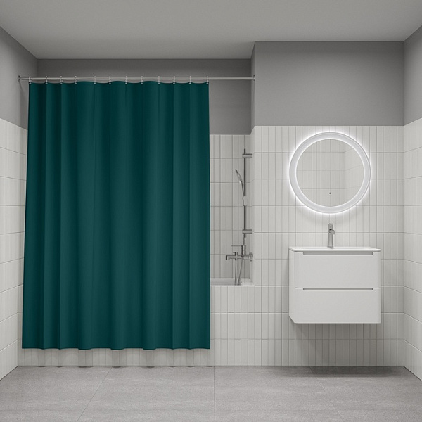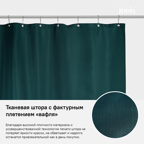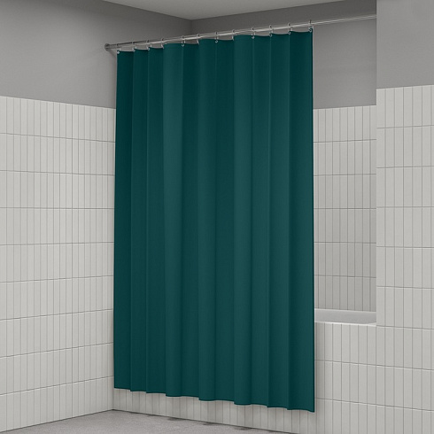 Однотонная текстильная штора для ванной насыщенного темно-зеленого цвета с фактурным рисунком «вафля». Напоминает обычные шторы и соответствует актуальному тренду оформления ванной как уютной жилой комнаты.