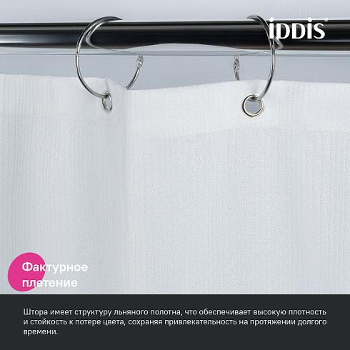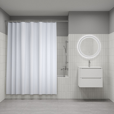 Однотонная плотная текстильная штора для ванной белого цвета с фактурой натурального льна, что делает ее элегантной и утонченной. Напоминает классические текстильные шторы и соответствует актуальному тренду оформления ванной как уютной жилой комнаты.