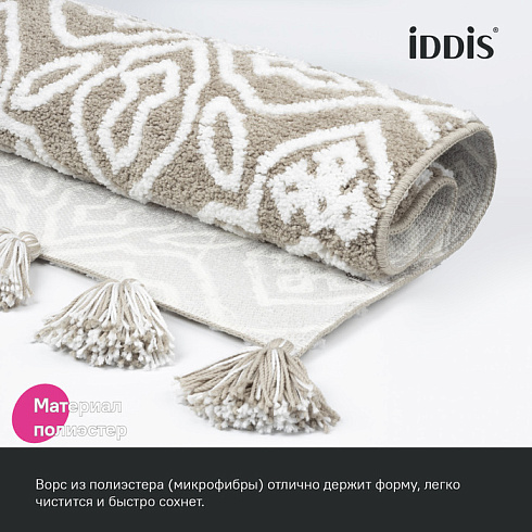 Мягкий бежевый коврик для ванной с декоративными пушистыми кисточками и белым узором, очень приятный на ощупь. Ворс из микрофибры отлично держит форму, легко чистится и быстро сохнет. Коврик подойдет для ванной и туалета, а также поможет создать уют в спальне или гостиной.