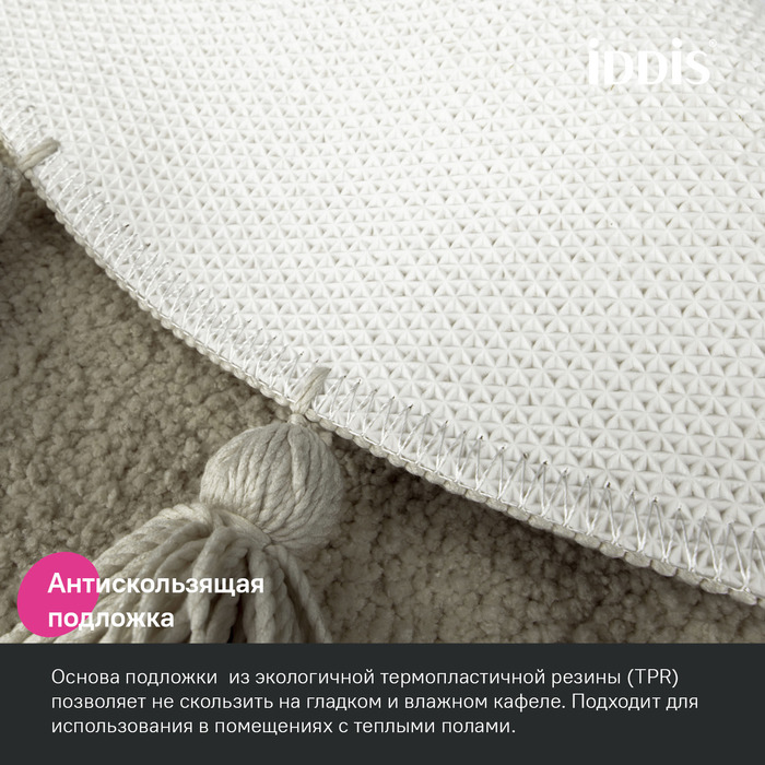 • Коврик противоскользящий: основа из экологичной термопластичной резины (TPR) позволяет не скользить на гладком и влажном кафеле. Подходит для использования в помещениях с теплыми полами.