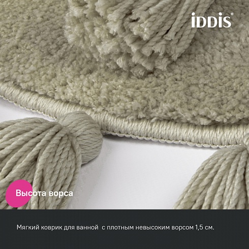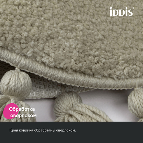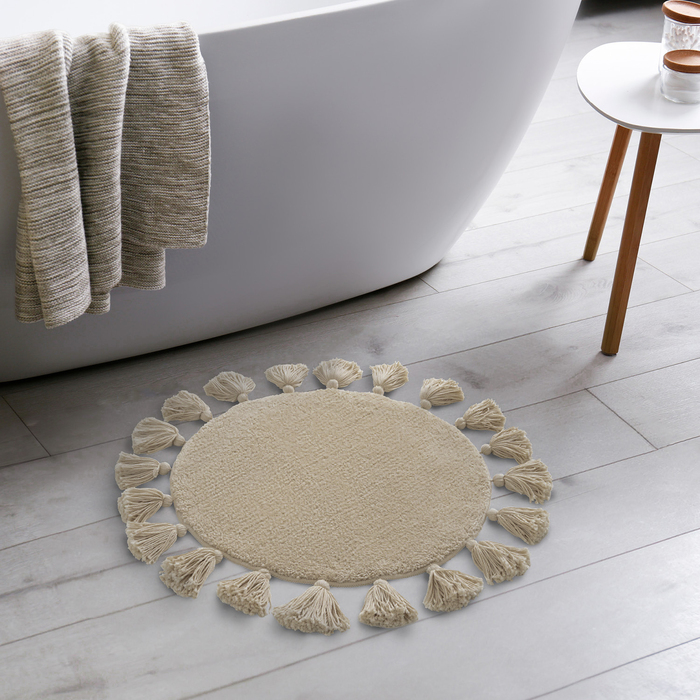 Мягкий круглый бежевый коврик для ванной диаметром 55 см с декоративными пушистыми кисточками, очень приятный на ощупь. Ворс из микрофибры отлично держит форму, легко чистится и быстро сохнет. Коврик подойдет для ванной и туалета, а также поможет создать уют в спальне или гостиной.