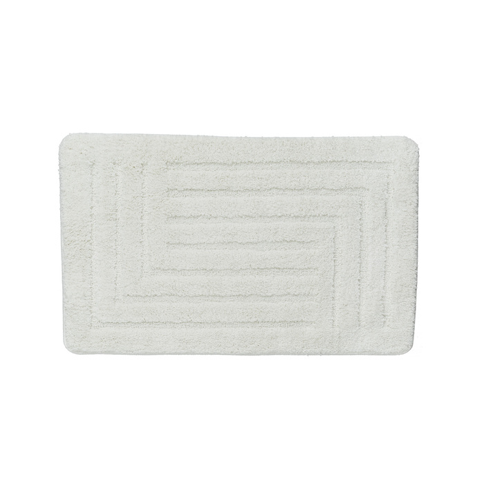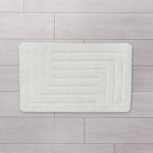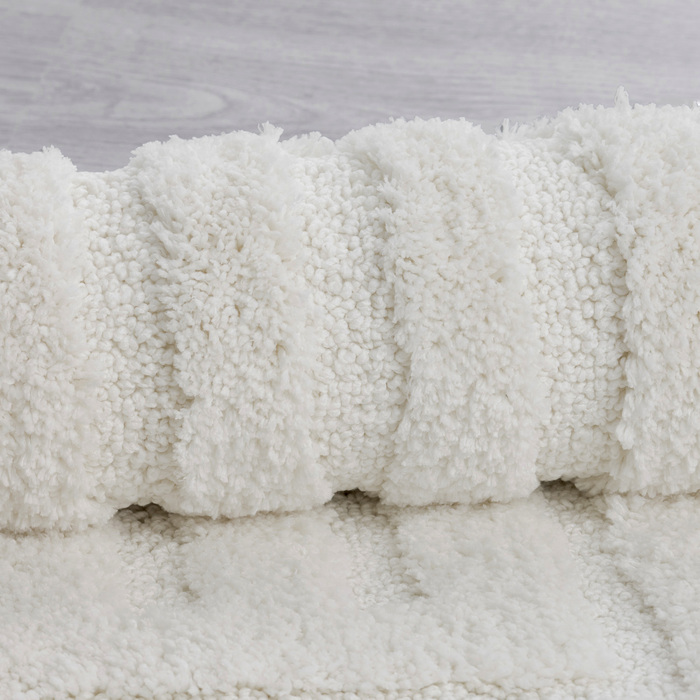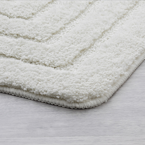 Коврик для ванной белоснежного цвета с плотным фигурным ворсом (1,5 см), мягкий и очень приятный на ощупь. Ворс из микрофибры отлично держит форму, легко чистится и быстро сохнет.