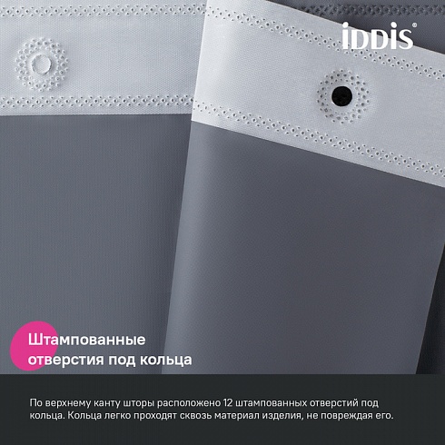 • По верхнему краю 12 штампованных отверстий-люверсов – кольцо/крючок легко пройдет насквозь, не повредив шторы.