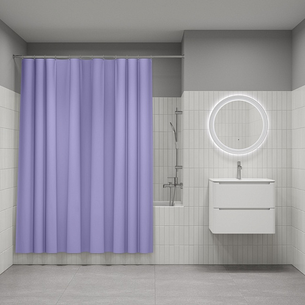 Однотонная непрозрачная штора для ванной красивого лавандового оттенка. Изготовлена из современного материала PE – мягкого, прочного, приятного на ощупь, экологичного и безвредного для здоровья термопластика.