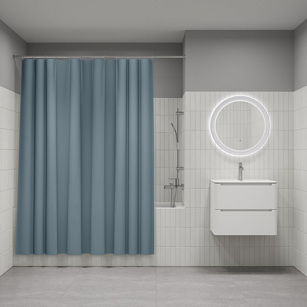 Однотонная непрозрачная светло-серая штора для ванной. Изготовлена из современного материала PE – мягкого, прочного, приятного на ощупь, экологичного и безвредного для здоровья термопластика.