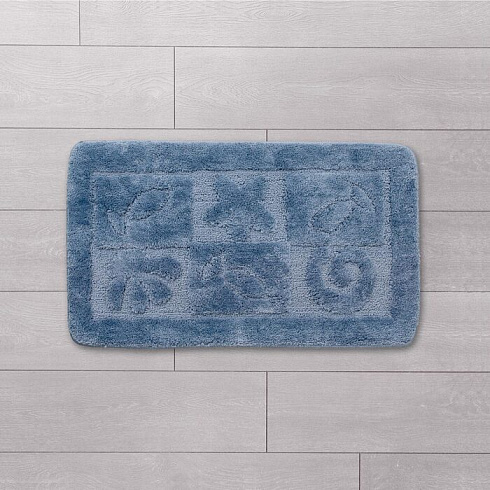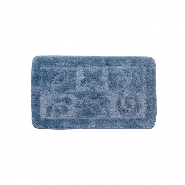 Коврик для ванной синего цвета с плотным ворсом (1,5 см), выстриженным в виде морских фигур, мягкий и очень приятный на ощупь. Ворс из полиэстера отлично держит форму, легко чистится и быстро сохнет.