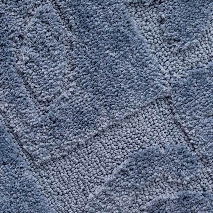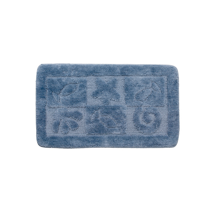 Коврик для ванной синего цвета с плотным ворсом (1,5 см), выстриженным в виде морских фигур, мягкий и очень приятный на ощупь. Ворс из полиэстера отлично держит форму, легко чистится и быстро сохнет.