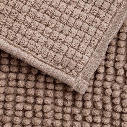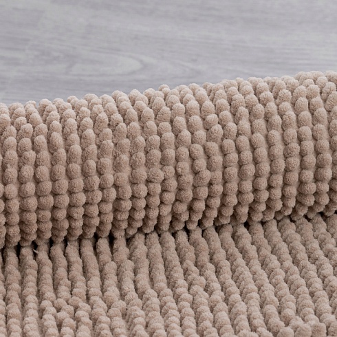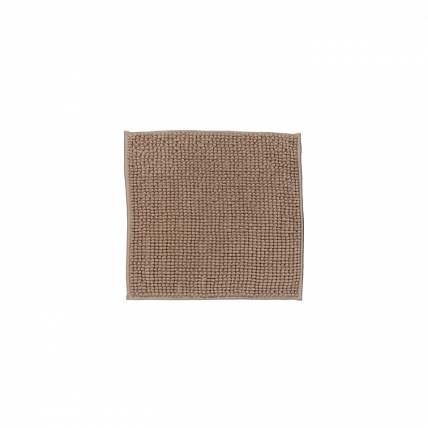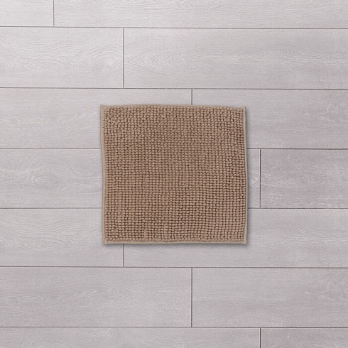 Коврик для ванной цвета какао с невысоким пальчиковым ворсом (1 см), мягкий и очень приятный на ощупь. Ворс из микрофибры отлично держит форму, легко чистится и быстро сохнет. За счет небольшого размера коврик подойдет для ванной и туалета.